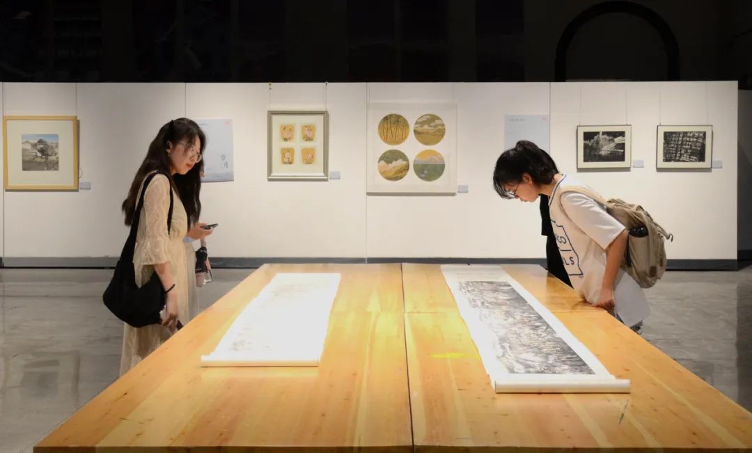▲2021狮山艺术节,关于“丹青·岁月”主题画展现场观展的同学(匡敏 摄)
