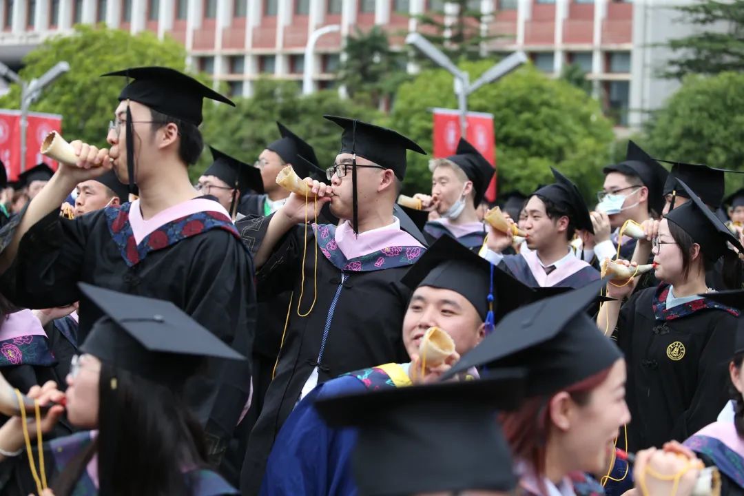 ▲2021毕业季,毕业典礼上,毕业生吹响“狮山号角”(侯国涛 摄)