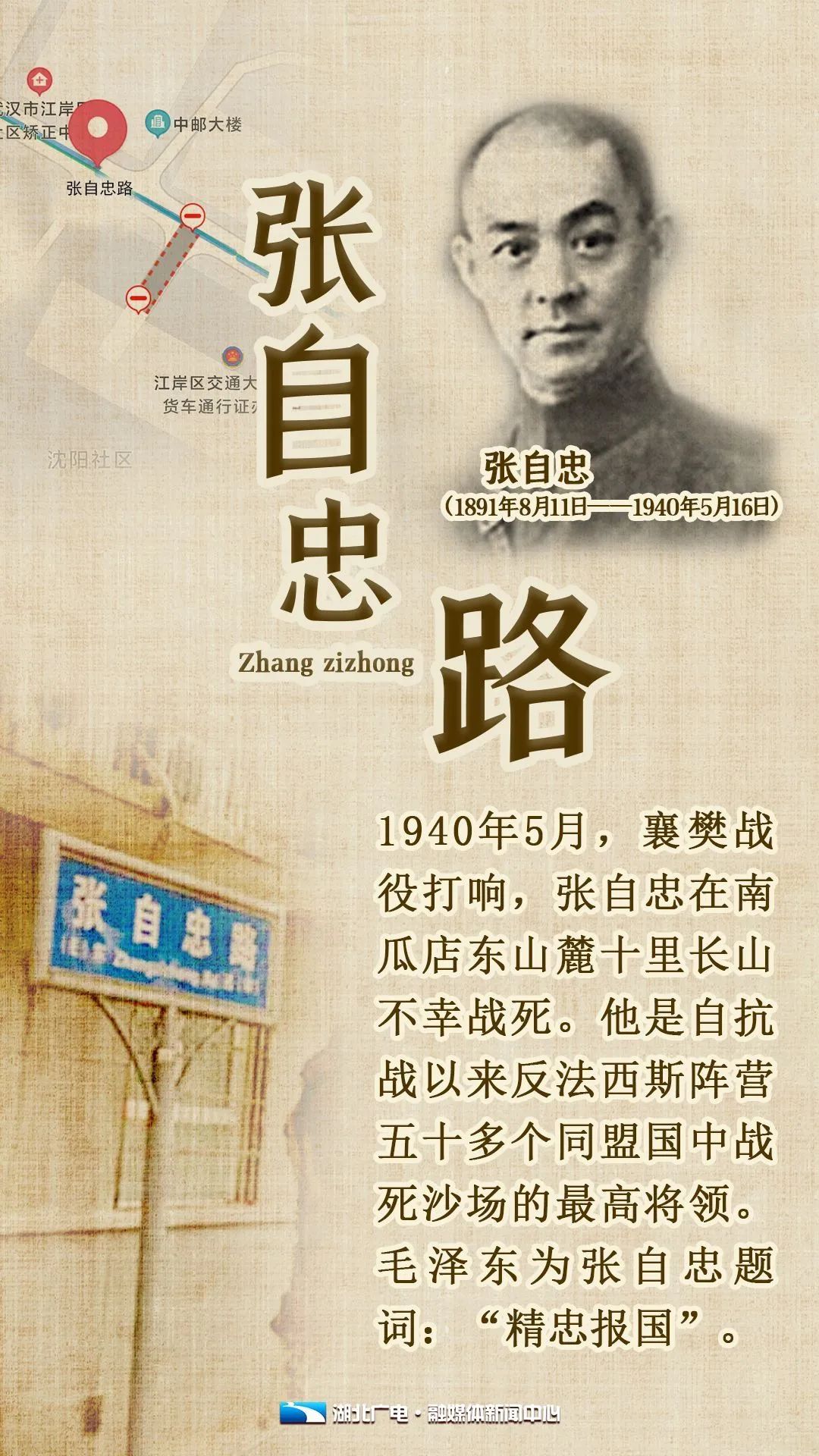 汉口中山大道通往江边有一条小路,建于民国初年,原名“成忠路”。1946年,这条路更名为“张自忠”路,解放后先后被更名为红卫八路、抚顺路。1985年7月4日,武汉市人民政府根据省市政协、广大人民群众的建议,为纪念抗日战争胜利40周年,恢复“张自忠路”的名称。