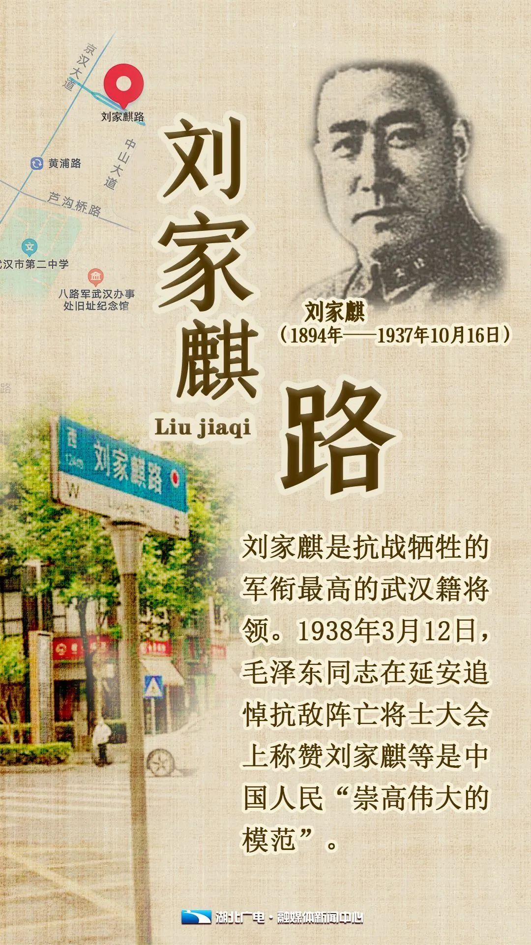 1946年,纪念刘家麒将军的刘家祺路被正式命名,后经2次改名,1985年复名刘家祺路。但据研究考证,“刘家麒”是正确的名字。经江岸区政府同意,已将刘家祺路更名为刘家麒路。这条路西起京汉大道,东至中山大道,横穿江岸区武汉天地壹方。