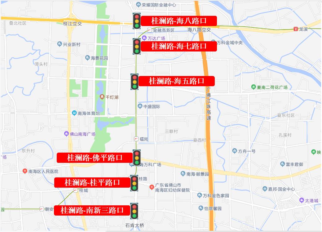 目前,南海区的佛平路、桂澜路、海五路、夏平路、永安路、广佛路、广云路、桃园路等路段陆续设置了分段绿波带或全段绿波带。