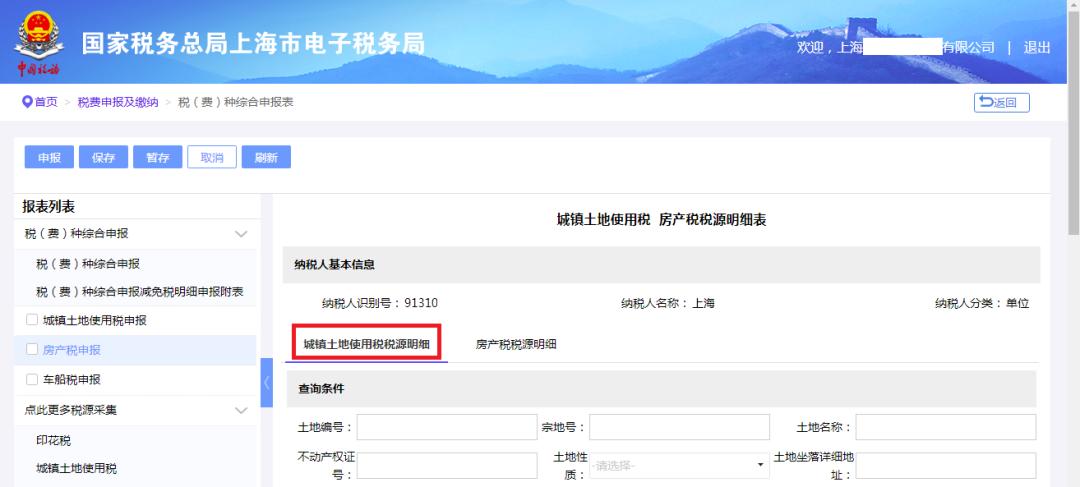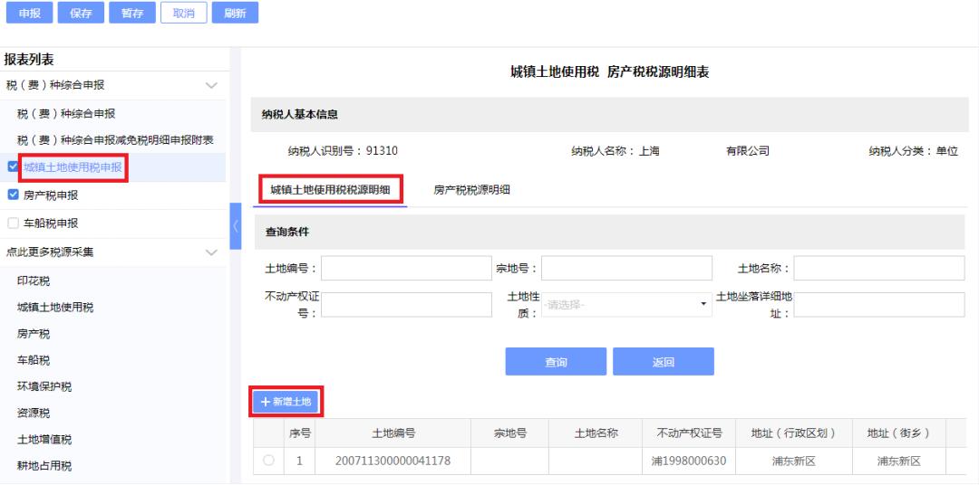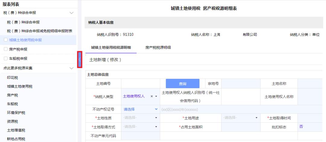 城镇土地使用税、房产税申报表从税源明细表中读取税源应税信息直接生成申报数据,因此申报的前置条件是税源明细采集和维护。