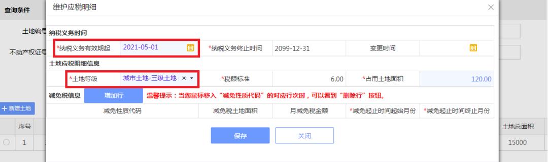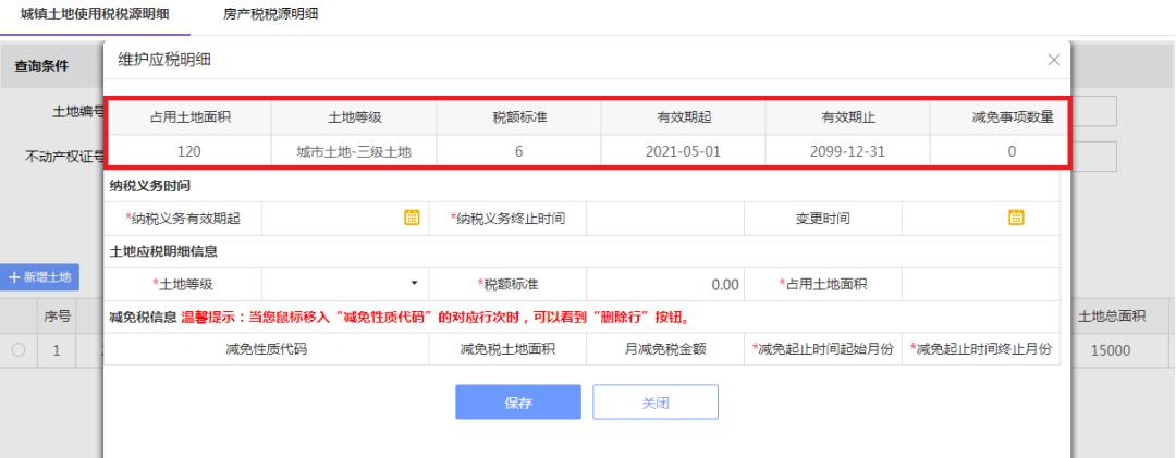 点击页面下方“关闭”按钮或者右上角“X”关闭“维护应税明细”页面。系统将自动返回“城镇土地使用税 房产税税源明细表”,新增土地已显示在下方列表中。