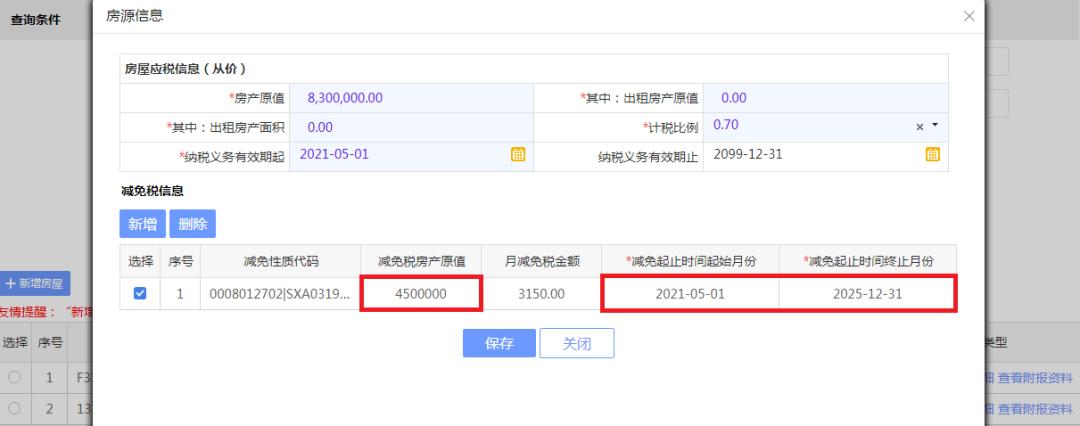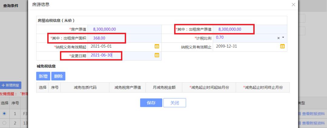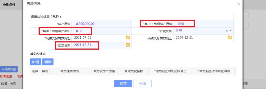 同时根据实际情况,填写“减免税房产原值”、“减免起止时间起始月份”、“减免起止时间终止月份”和“变更日期”。系统将自动根据“减免税房产原值”计算“月减免税金额”。