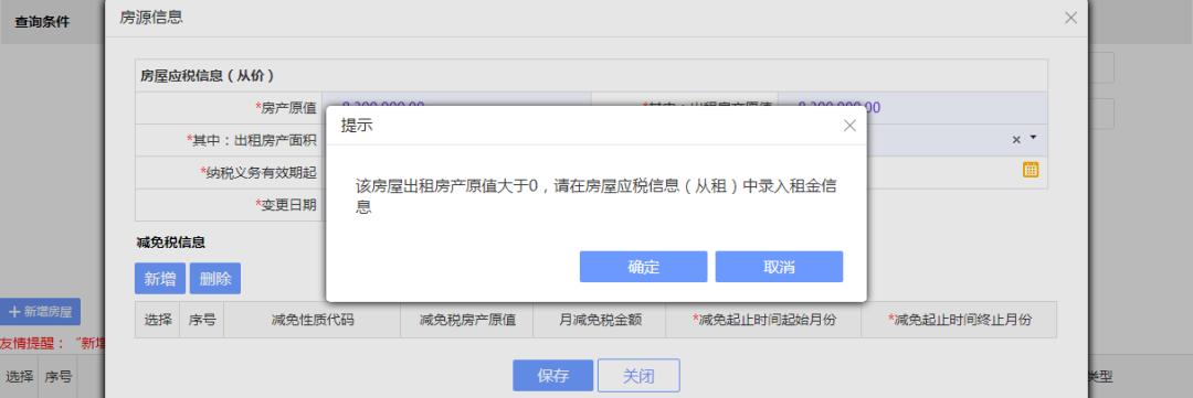 点击“保存”按钮,系统提示“该房屋出租房产原值大于0,请在房屋应税信息(从租)中录入租金信息”,点击“确定”即可。