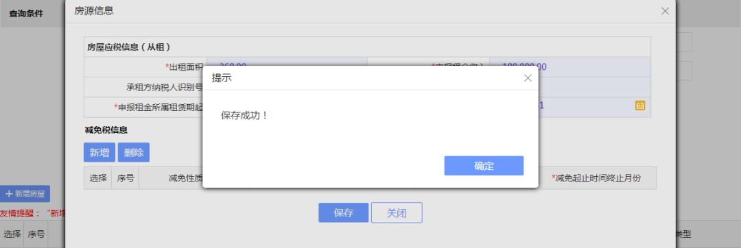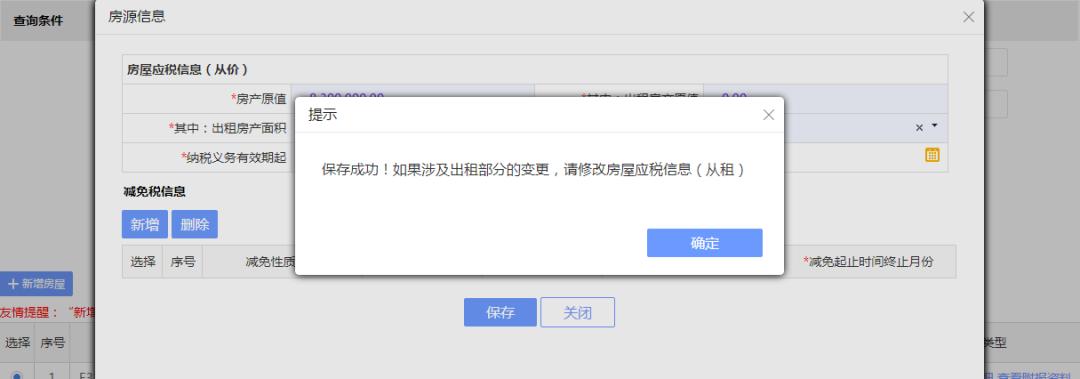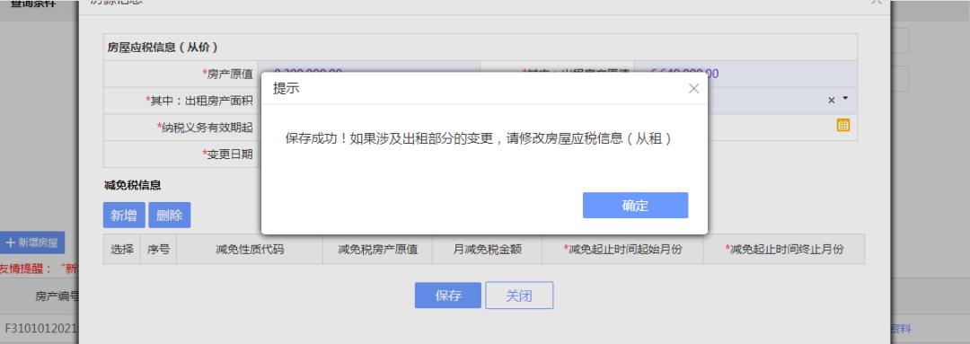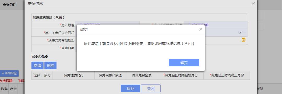 系统再次提示“保存成功!如果涉及出租部分的变更,请修改房屋应税信息(从租)”,点击“确定”。