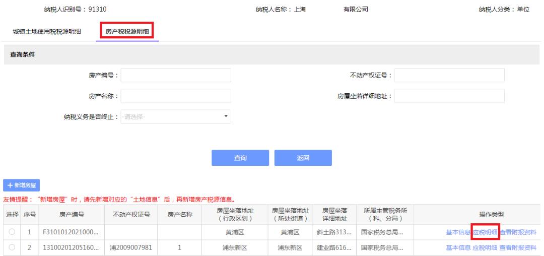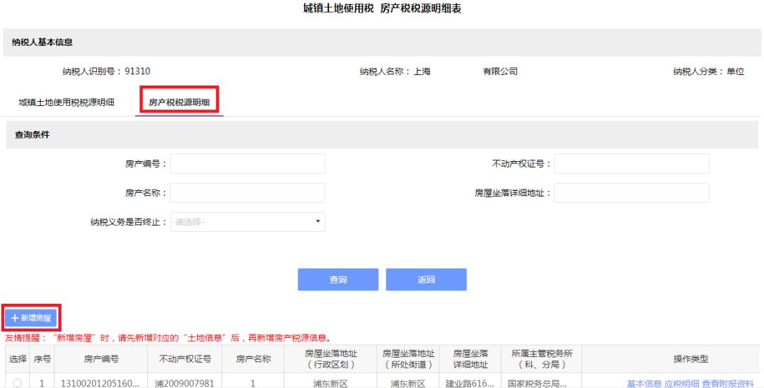 通常进入时,下半部分信息默认显示“城镇土地使用税税源明细”标签页,可以通过点击右侧“房产税税源明细”切换至“房产税税源明细”标签页。
