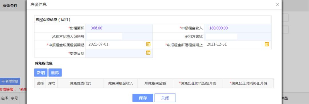 根据出租情况录入信息,根据假设2021年7月起出租5年,月租金(不含税)3万元。考虑到通常后期租金会出现变化,建议纳税人进行从租应税信息采集时,按照季度、半年或年度进行采集。假设此处选择半年为采集单位,则可以先新增2021年7月至12月的从租应税信息,对应出租收入为3*6=18万元。填写完毕后点击下方“保存”按钮。