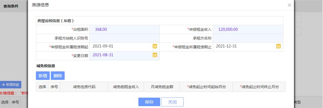 点击2021-09-01至2021-12-31对应从租应税信息后方的变更,跳转至“房屋应税信息(从租)”应税信息维护页面。
