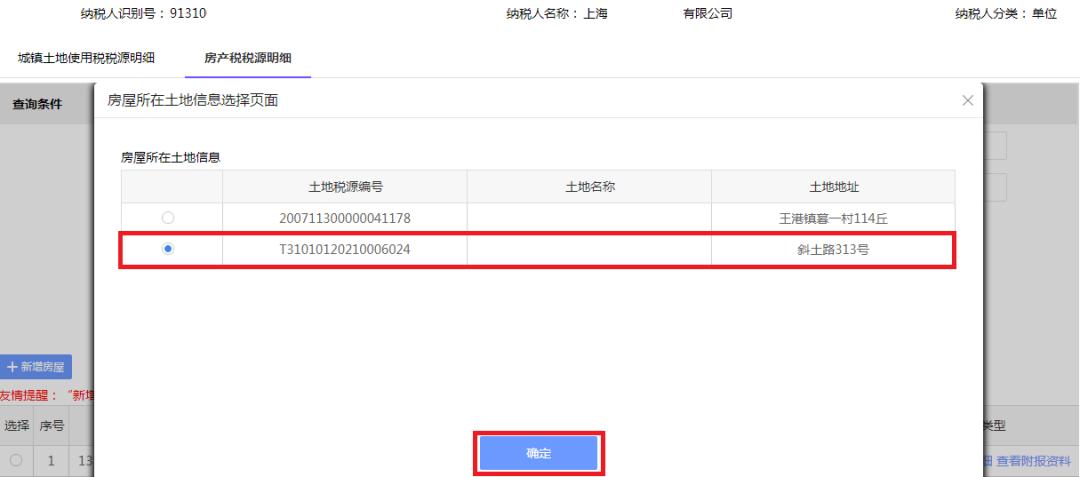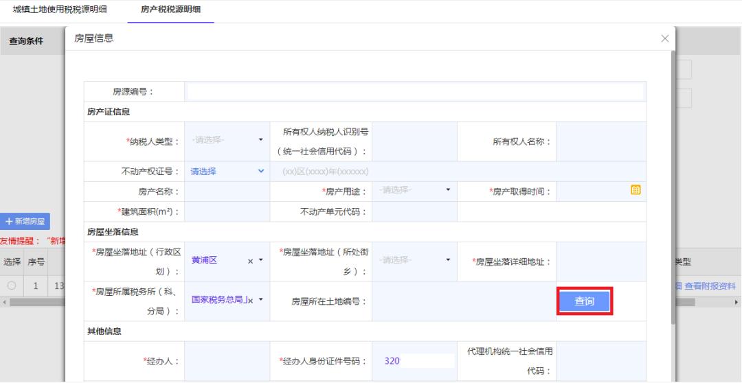 纳税人应根据不动产权证填写相关房产信息,其中“房屋所在土地编号”部分,应通过点击右侧“查询”按钮,在弹出的页面中勾选此前录入的土地信息来获取。