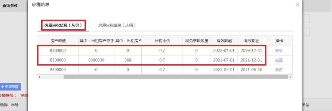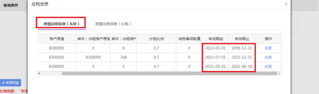 自动返回至此前“应税信息”维护页面,且默认显示的是“房屋应税信息(从价)”标签页。可以看到系统自动将2021-07-01至2099-12-31期间的从价应税信息拆分成了2021-07-01至2021-12-31以及2022-01-01至2099-12-31两段。