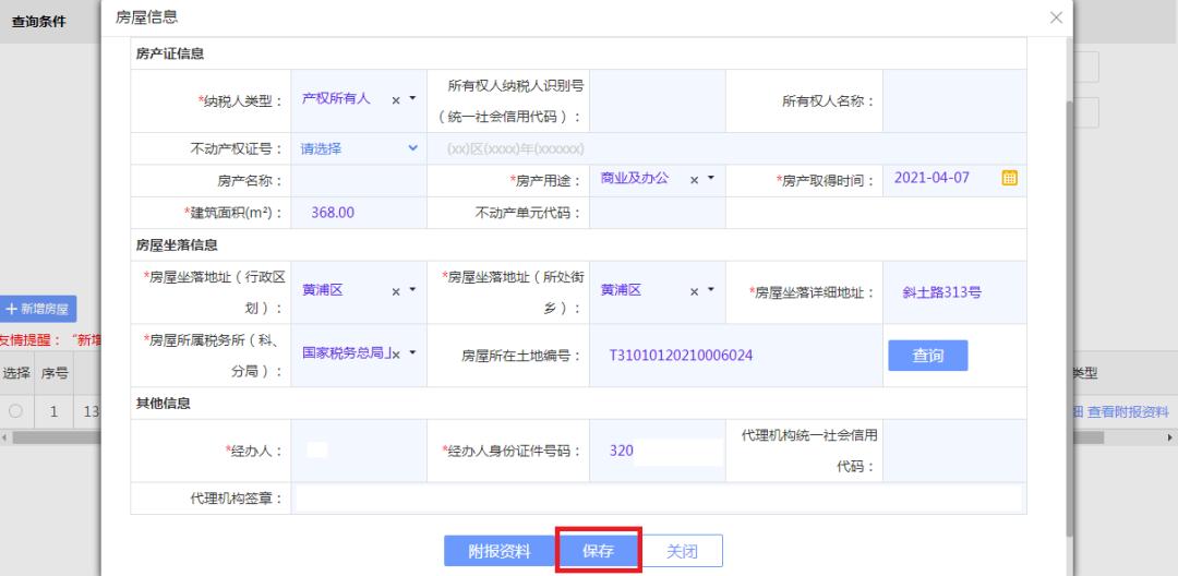 纳税人应根据不动产权证填写相关土地信息,填写完毕后点击页面下方“保存”按钮。