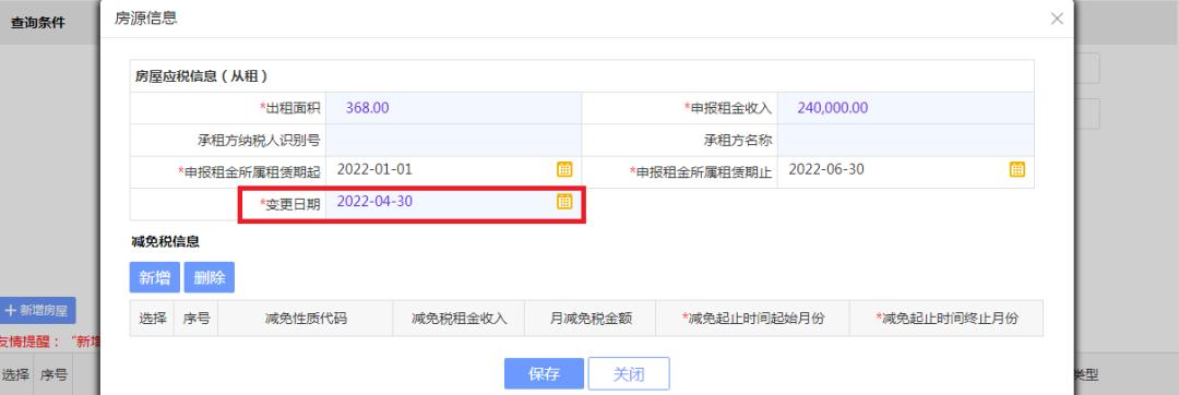 注意:由于修改“变更日期”会清空已填写的减免税信息,故纳税人应先填写“变更日期”,即开始享受优惠的前一天,2022-04-30。