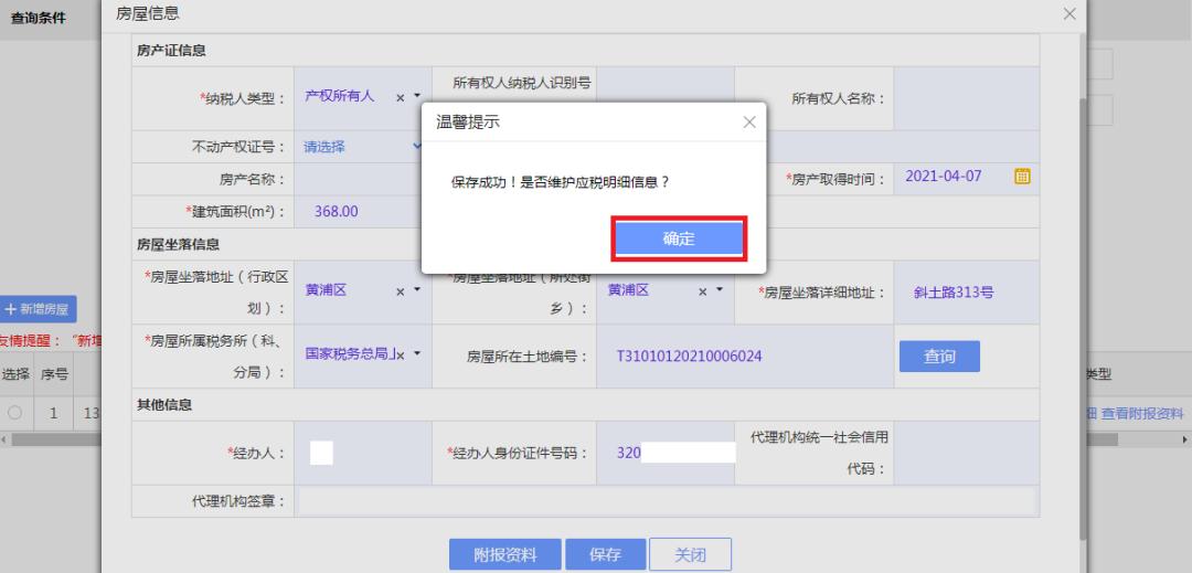 弹出提示“土地信息保存成功,是否维护应税明细信息?”点击“确定”,系统将自动跳转至“维护应税明细”页面。