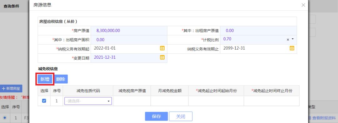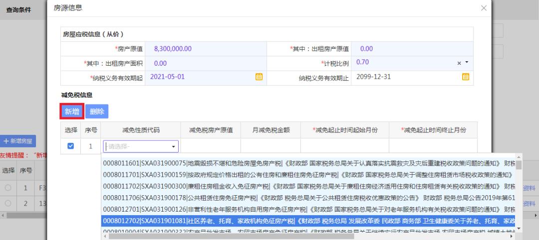 城镇土地使用税操作与房产税类似,此处以新增房产税减免税优惠举例进行演示。