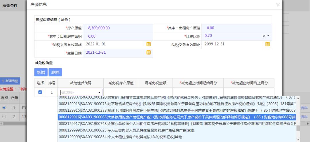在“减免性质代码”下拉列表中选择“大修停用的房产免征房产税”。