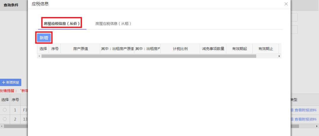 在“应税信息”维护页面中,共涉及两个标签页:“房屋应税信息(从价)”和“房屋应税信息(从租)”,默认显示在“房屋应税信息(从价)”标签页,点击“新增”按钮。