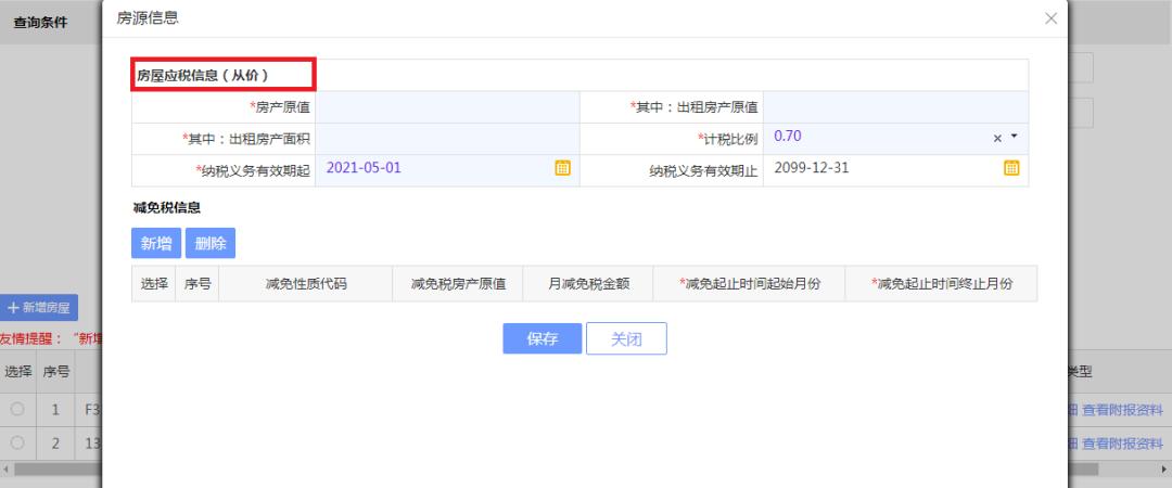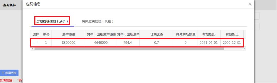 系统自动返回至此前“应税信息”维护页面下的“房屋应税信息(从价)”标签页,可以查看此前新增的房产税从价税源信息。
