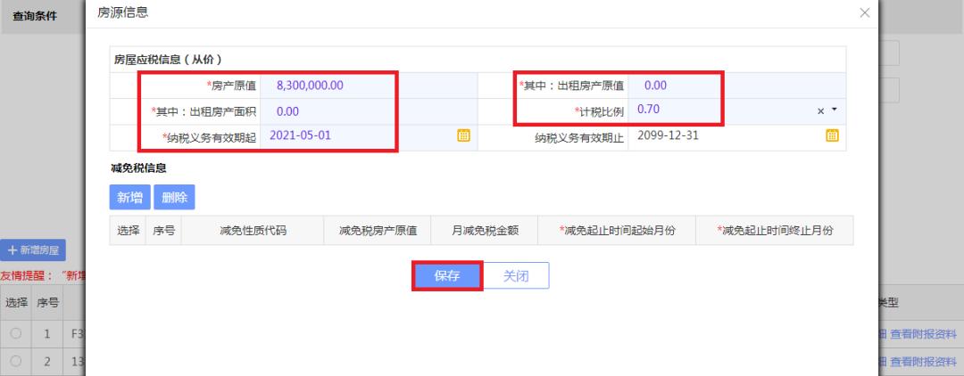 通常来说,纳税义务发生时间即为取得房产的次月起,即系统自动跳出的时间无需更改,根据沪府规〔2019〕5号,自2019年1月1日起,房产税从价计征的计税依据按照房产原值的70%计算,该举例房产取得时间为2021年4月,因此计税比例部分也无需修改。点击下方“保存”按钮。