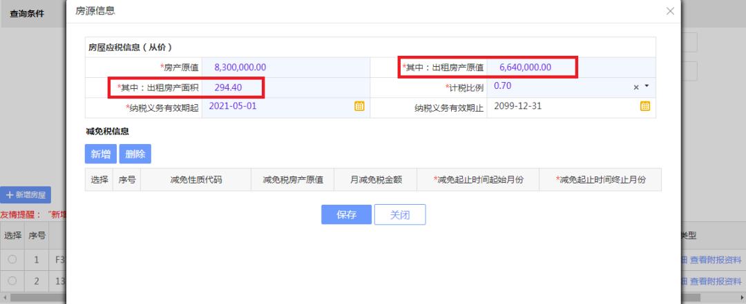 提示:此处双重提示的目的在于防止纳税人遗漏从租应税信息的采集,如从价应税信息中“其中:出租房产原值”或“其中:出租房产面积”不为“0”,而系统未提取到对应期限内有效的从租应税信息,申报时将强制阻断。