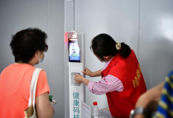 入口处一分为二,一侧是普通就诊群众通道,另一侧是为老年人预备的老年方舱。老年方舱内部有一台自助登记的仪器和一名负责手工登记流调信息的工作人员。“老年人用社保卡或者身份证在仪器上刷一下就可以出现健康码的状态,没有健康宝的老年人可以手工登记。”贡欣扬介绍,还有一些患者只是来医院挂号或者取报告,医院为这部分人专门开辟了一块场地,用于提供门诊自助服务,患者就不需要进行流调登记,从而减少了医院内部的人员聚集。