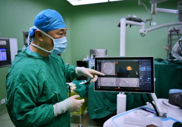 在中日友好医院手术室,一台面肌痉挛的手术准备进行。术前,该院神经外科主任于炎冰通过机器人精准定位,找到责任血管,规划出手术的最佳路径。