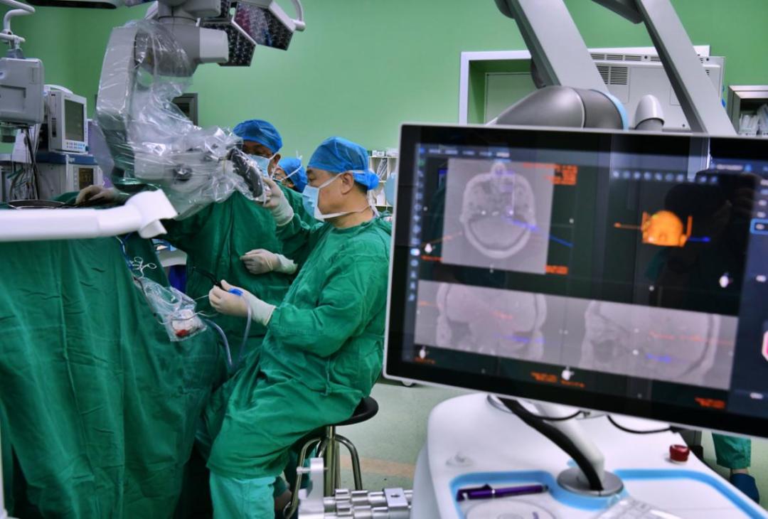 中日医院手术室内,医生利用先进的手术机器人精准定位,为患者进行手术。