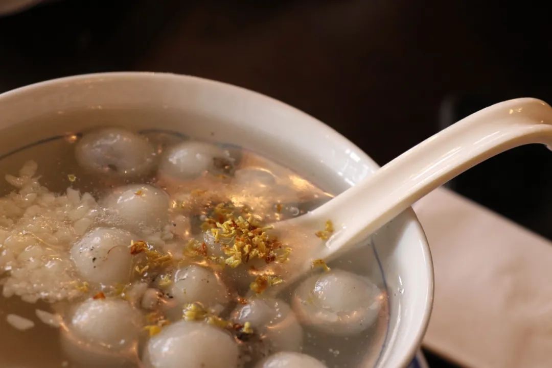 一碗桂花汤圆,外皮糯而Q弹,汤底中还拥有浓郁的桂花蜜香味,再加上红枣的一丝甜,吃一口就已经非常惊艳。