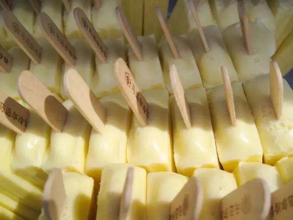 它采用新鲜纯天然水果或新西兰复原奶制作,拥有原味奶、草原奶、巧克力和草莓四种口味,形似一个大砖块,入口清爽,口感丝毫不厚重。