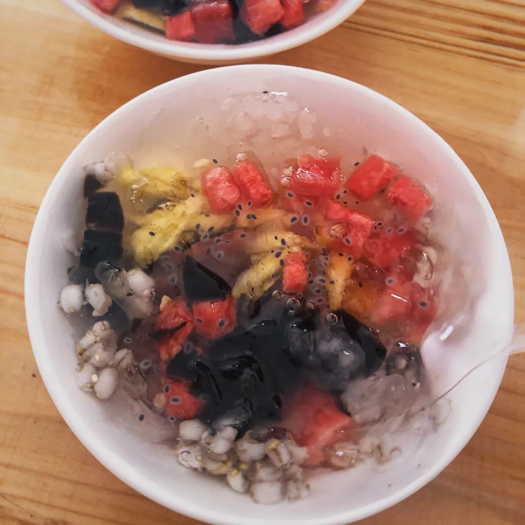 在西瓜汁中加入冻粉做成固体状的吃食,再浇上糖水,搭配上一些新鲜水果,就成了一碗清凉爽口的西瓜酪。