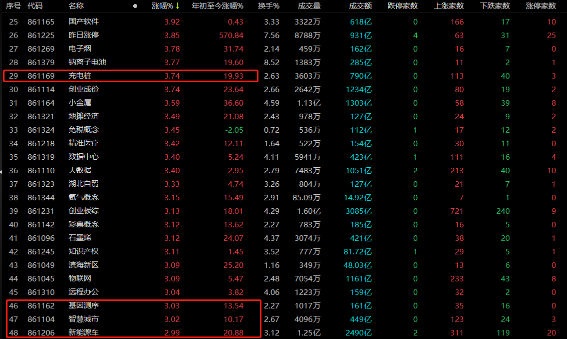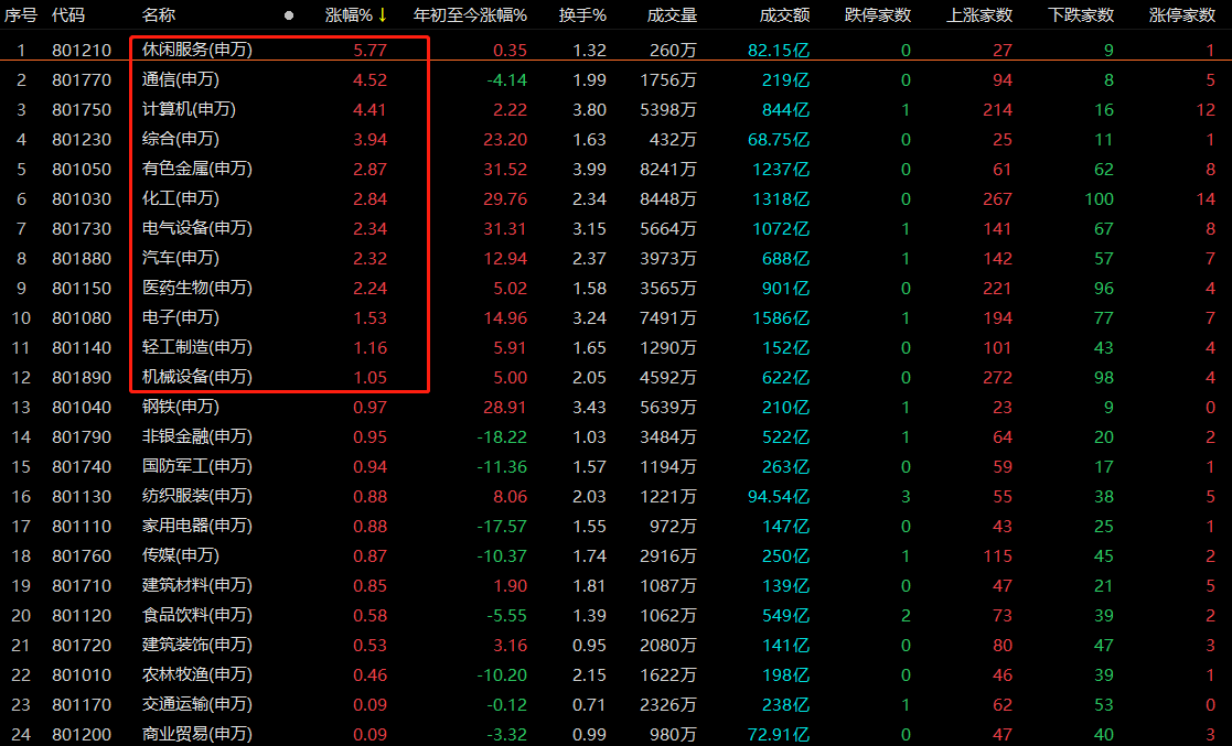 28个申万一级行业中共计24个板块飘红,休闲服务、通信、计算机板块均涨逾4%,年内火爆的有色金属、化工、电气设备板块也均涨逾2%,采掘、房地产、银行板块飘绿。