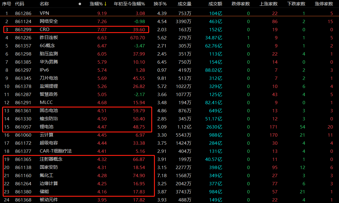 概念板块方面,今日CRO概念上涨7.07%,药明康德、泰格医药、凯莱英等19只相关概念股全涨;固态电池、锂电池、储能等概念板块涨幅均超过4%,宁德时代、比亚迪、赣锋锂业均大涨;充电桩、新能源车概念也上涨,亿纬锂能、阳光电源、恩捷股份等个股涨势喜人;国家安防、鸿蒙概念、国产芯片、半导体等概念股也表现不错,海康威视、润和软件、韦尔股份、中兴通讯个股大涨。