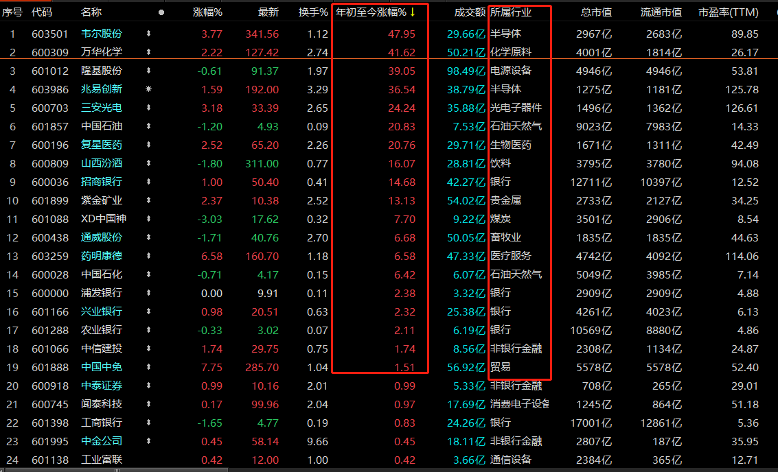 上证50成份股年内也表现分化,半导体、电源设备、化学原料、贵金属、光电子电器等行业个股涨势不错,比如韦尔股份、万华化学、隆基股份、兆易创新个股涨幅均超过36%,三安光电、中国石油、复星医药个股年内涨幅超过20%。