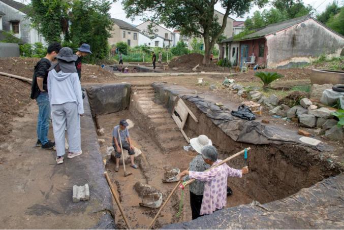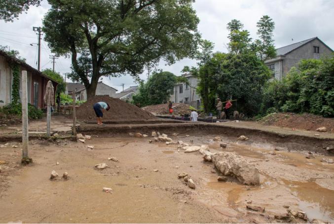 从地形上看,考古发掘现场背靠茂山,前面是现代民居,可供发掘的范围受限。这次发掘揭露面积为180多平方米,正式探沟发掘面积仅100来平方米。因依圆弧状堆砌的石块中心位置,正好是一幢供附近寺庙僧人租住的平房,房前还有一棵二人合抱的香樟树,考古团队无法进一步发掘,留下了遗憾。