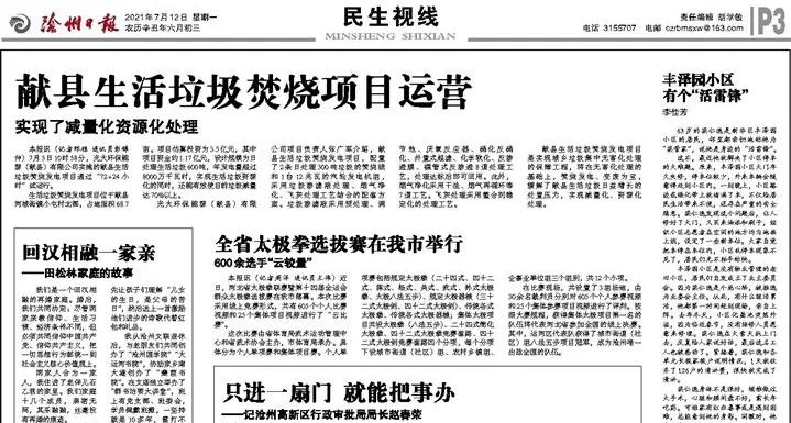 原标题:《沧州日报:献县生活垃圾焚烧项目运营 实现了减量化资源化处理》