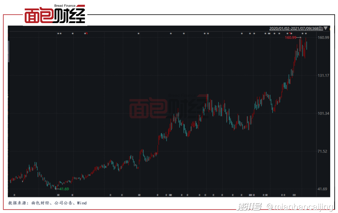此外,自公司在2020年11月23日第一次发布股东建发集团计划减持的公告至今,公司股价(收盘价)由94.28元/股上涨至158.14元/股,在半年多时间内上涨67.73%。把时间线拉长来看,2020年年初至今,公司股价累计上涨逾230%。