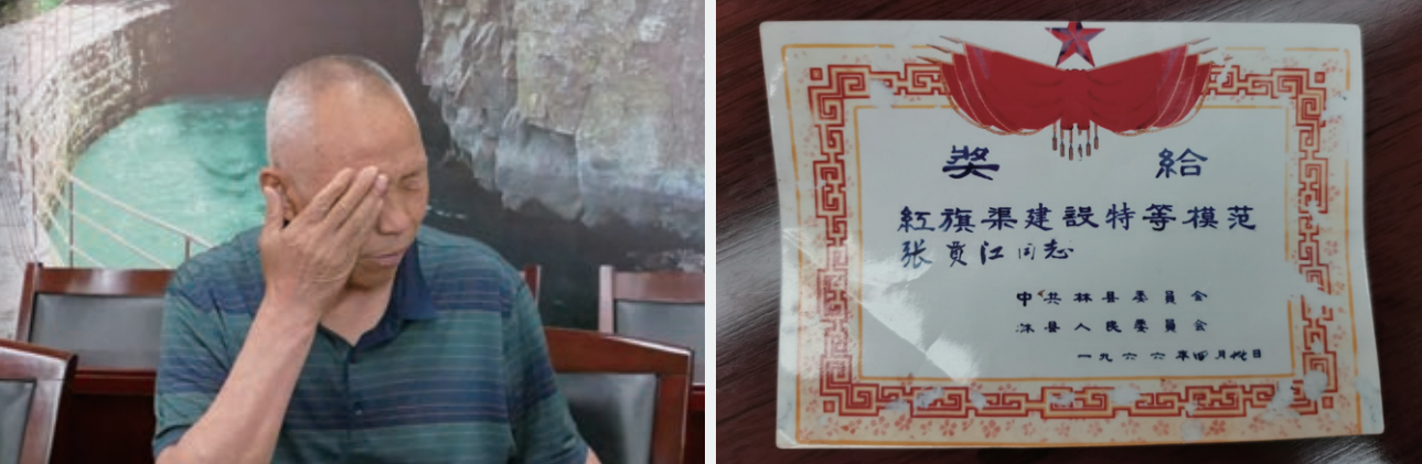 特等劳模 1961年春节刚过,张买江继承父亲遗志,成为红旗渠工地年龄最小的建设者。左图为他在接受《小康》杂志、中国小康网记者专访时,动情回忆当年的修渠往事;右图为1966年4月他被评为红旗渠建设特等劳动模范获得的奖状。