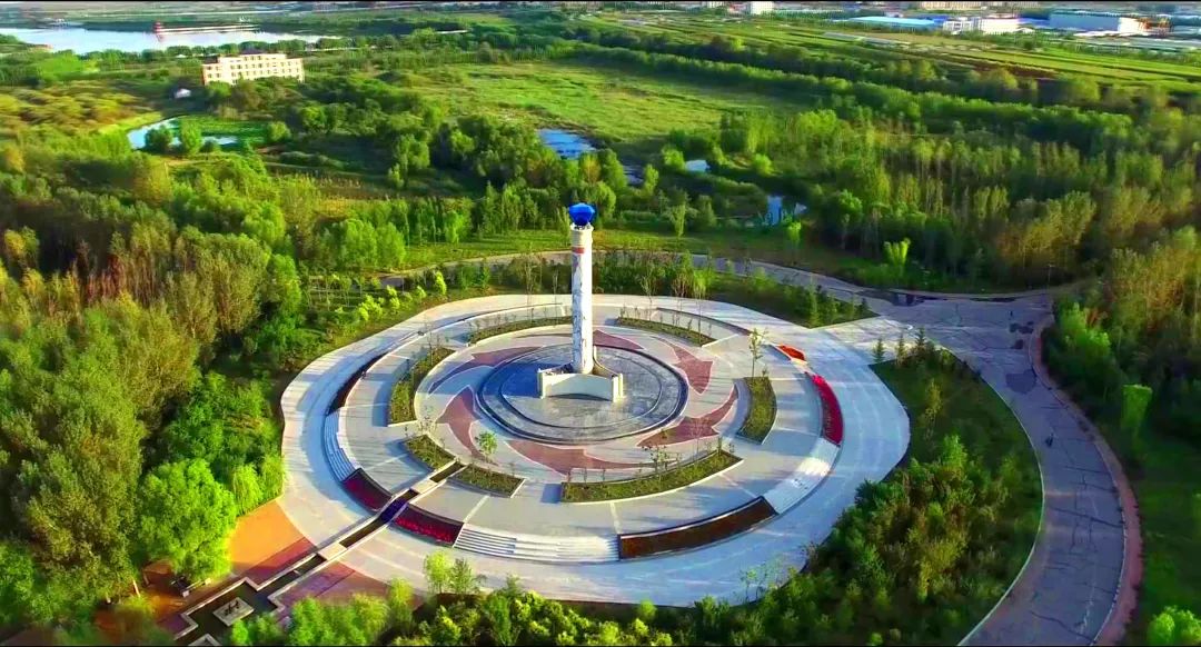 “嫩江之眼”主题雕塑,由冠顶、柱体、基座三部分组成。冠顶托举着蓝光闪烁的钻石,寓意着大安的版图形状。柱体上是嫩江大安段的走势图,黄色的条纹代表嫩江。基座的三幅大理石画轴浓缩了大安古老的历史。