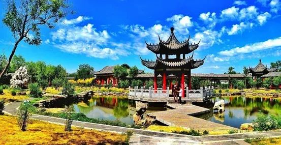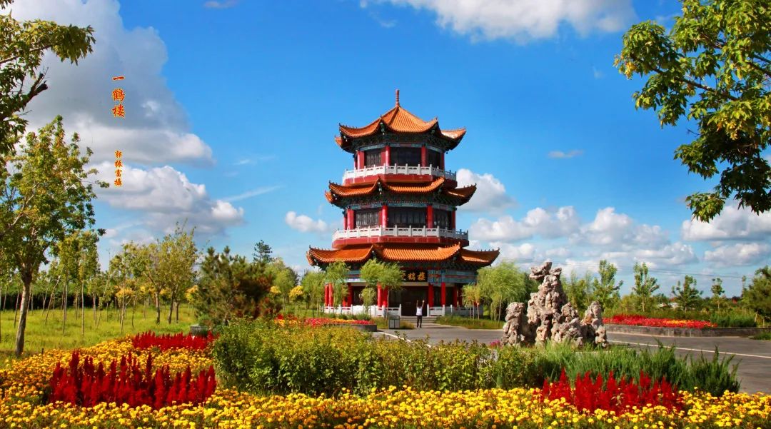 一鹤楼,楼高27米,共3层,三面环水。楼名取自于唐代著名诗人刘禹锡的诗句:“晴空一鹤排云上,便引诗情到碧霄。”