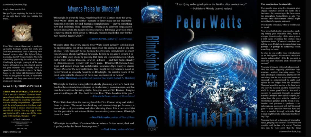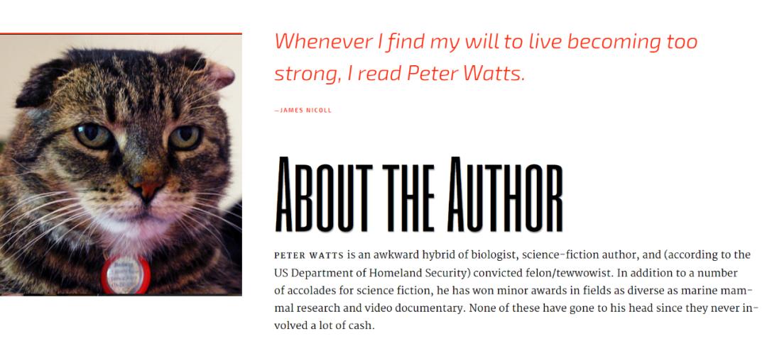 这本书的作者,加拿大科幻小说家彼得·沃茨,曾经是一位研究海洋哺乳动物的科学家。他的处女作写的就是一个发生在深海的故事,所以他的小说有非常坚实的科研基础,每一本都有一个很长的后记,介绍小说中的点子来源于哪一篇研究论文,思路如何,等等。可以说读一遍后记,就相当于读了一篇研究综述。