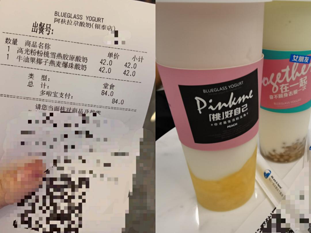 为了更方便、更直观的了解产品口味和信息,燃财经点了当时店里的热销产品“高光粉粉桃雪燕胶原酸奶”(以下简称“桃桃酸奶”)和“牛油果椰子燕麦爆珠酸奶”(以下简称“牛油果酸奶”),两杯酸奶的售价均为42元/杯。