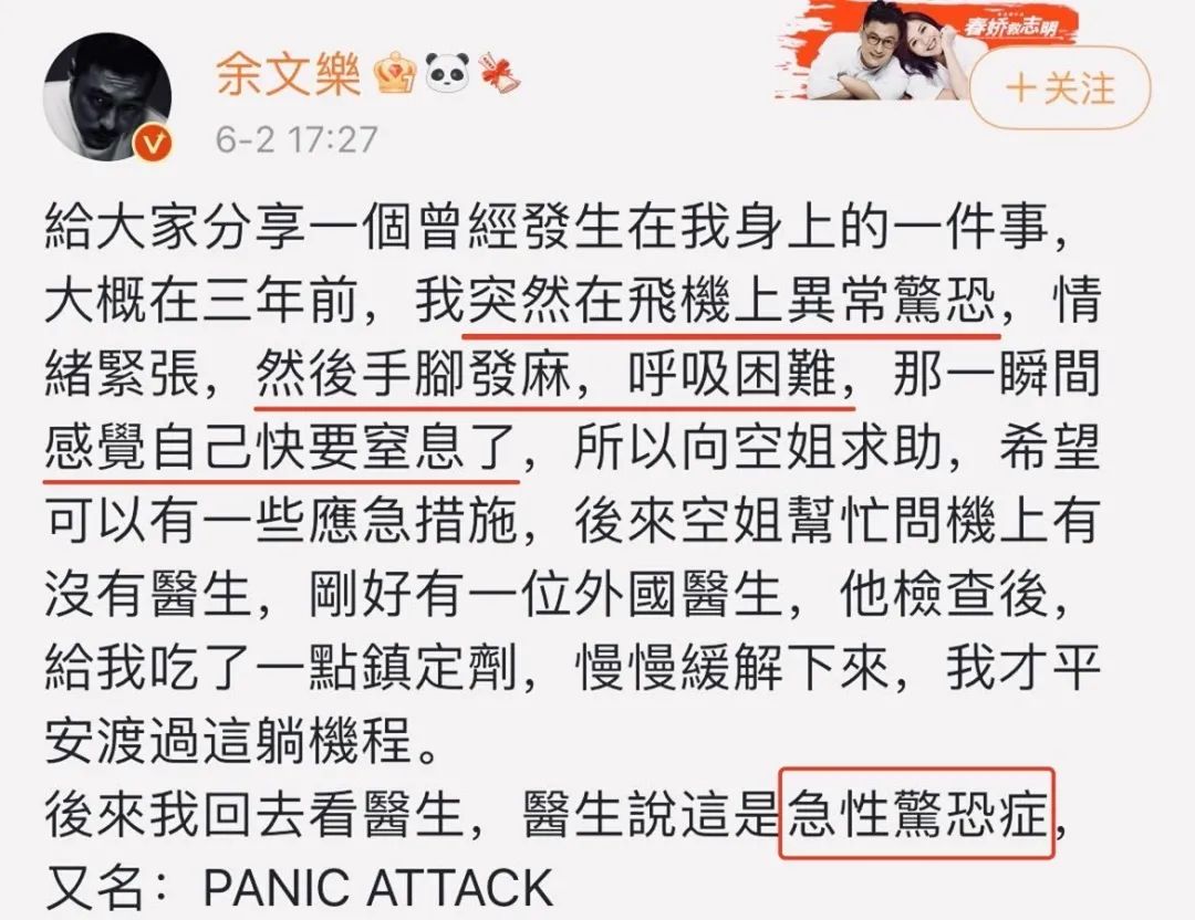 有一次在飞机上,余文乐忽然感觉情绪紧张、手脚发麻、呼吸困难。