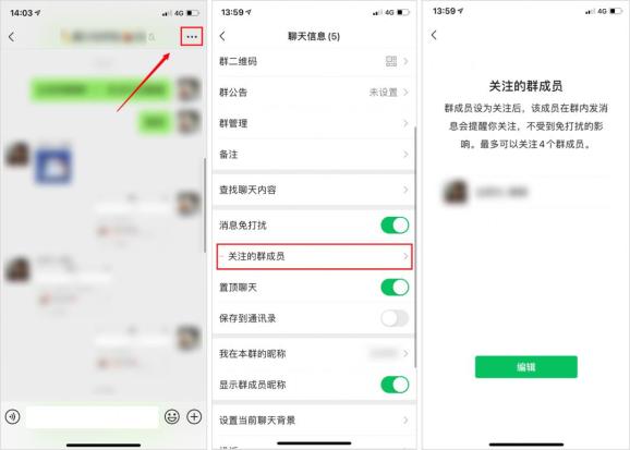 用户在将微信更新到最近新版本后,点击群聊右上角“···”,就可以通过“关注的群成员”设置自己想要关注的人(最多 4 个)。