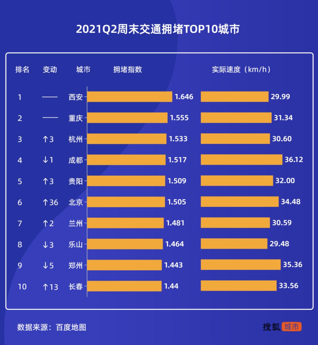 《报告》显示,今年二季度,周末交通拥堵指数最高的10大城市分别是西安、重庆、杭州、成都、贵阳、北京、兰州、乐山、郑州和长春。其中高居前四的西安、重庆、杭州和成都都是网红旅游城市,西安至少已连续一年位居周末交通拥堵榜榜首。