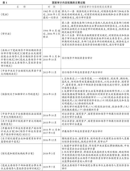 国家审计是党和国家监督体系中审计监督的主导力量。国家审计具有法定性,其审计内容是制度规定的②,本文将相关法律、规章、制度和国家审计内容拓展的主要过程归纳为表1。
