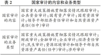 从表1可以看出,十八大以来,国家审计的内容从《宪法》和《审计法》规定的政府财政收支和国有企事业单位财务收支审计(《审计法》中还包括领导干部经济责任审计),拓展到国家重大政策措施贯彻落实情况、公共资金、国有资产、国有资源、领导干部经济责任和自然资源资产离任(任中)审计等各个方面。胡泽君将当前国家审计的内容归纳为五大方面和八种业务类型,具体见表2。
