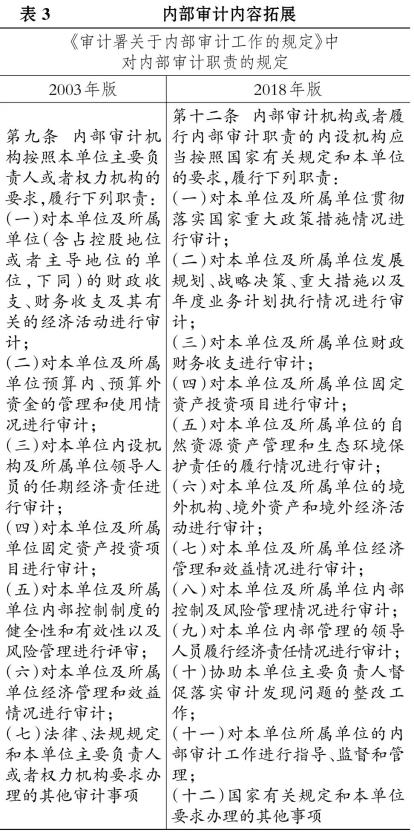 内部审计在审计监督中具有基础性作用。在国家审计的主导下,内部审计的内容也发生了较大的变化,本文将《审计署关于内部审计工作的规定》2003年版和2018年版规定的内部审计职责进行了详细的对比(见表3),来观察内部审计内容的拓展。不难发现,内部审计的内容已从财政财务收支、经济责任、固定资产投资、内部控制、经济管理效益等传统领域,拓展到涵盖贯彻落实国家重大政策措施情况、发展规划、战略决策、自然资源资产管理和生态环境保护、境外活动等更广泛领域。需要指出的是,《审计署关于内部审计工作的规定》适用于依法属于审计机关审计监督对象的单位的内部审计工作,其他单位可以参照执行。但是,不管是何种类型的单位,为了完善治理、提高管理水平、加强风险防范,其内部审计工作必须逐渐加强和完善,内部审计内容的拓展已经成为一个不争的事实。