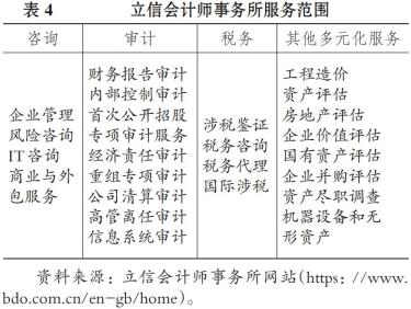 社会审计又称注册会计师审计、民间审计等。社会审计是以经政府有关部门审核批准的注册会计师为主体,接受委托,依法独立开展业务,有偿为社会提供审计服务的职业活动。社会审计是一种市场行为,其传统核心业务是财务报表审计,但是随着市场需求的多样化,社会审计的业务范围早已超出财务报表审计的范围。例如,中国注册会计师协会在公布《2018年度业务收入前100家会计师事务所信息》时区分了会计师事务所鉴证业务收入和非鉴证业务收入,并说明:“会计师事务所鉴证业务收入,包括:财务报表审计收入(含年报审计、中报审计和专项审计),内部控制审计收入,验资收入,工程预决算审核收入,涉税鉴证收入和其他鉴证业务收入。会计师事务所非鉴证业务收入,包括:资产评估收入、会计服务收入、税务服务收入、管理咨询收入、培训收入和其他收入”③。可见,财务报表审计只是社会审计业务中的一种,社会审计的服务范围远大于此。又如,立信会计师事务所的服务范围包括咨询、审计、税务、其他多元化服务四大类共25种,具体见表4。