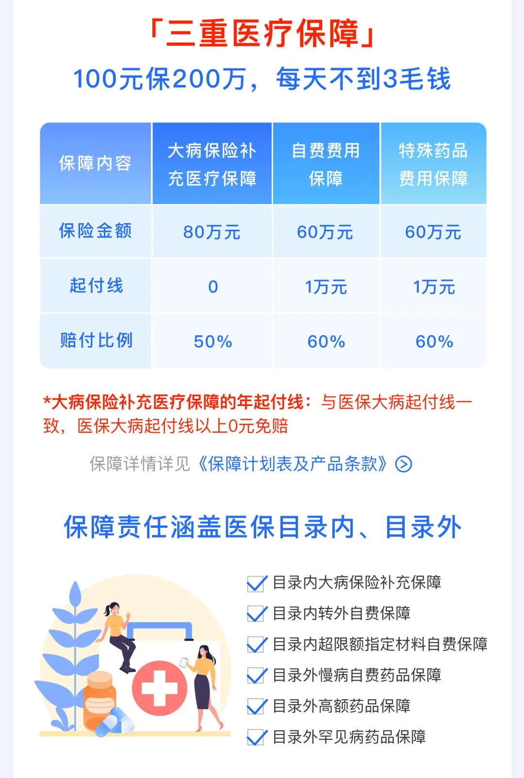 答:起付线同医保大病起付线,医保大病起付线以上0免赔额,赔付比例50%,保障额度为80万元。
