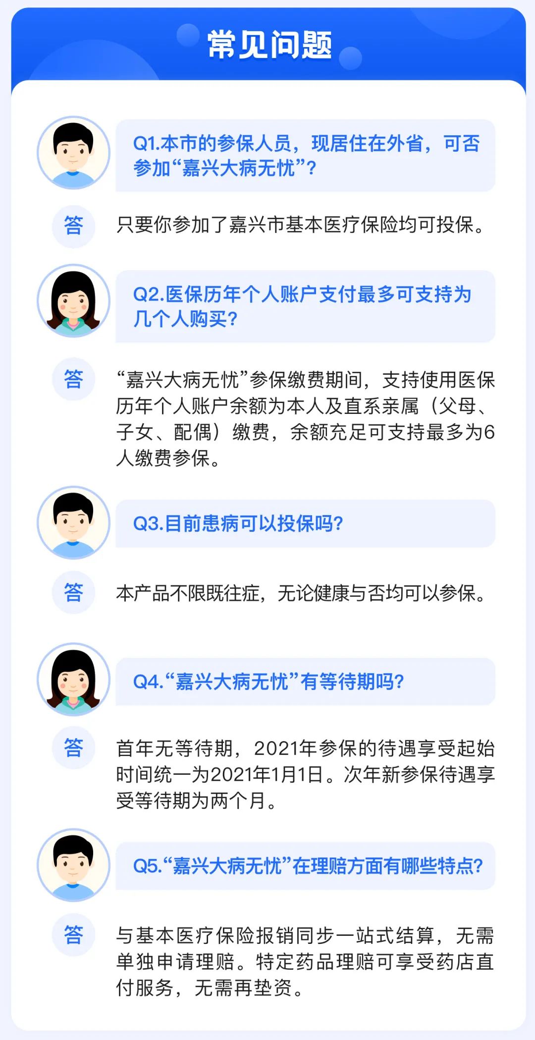 答:凡是嘉兴市(包括市本级、海宁市、桐乡市、平湖市、嘉善县、海盐县)基本医疗保险参保人员都可以参加“嘉兴大病无忧”,不限性别、年龄、健康状况、职业等限制。